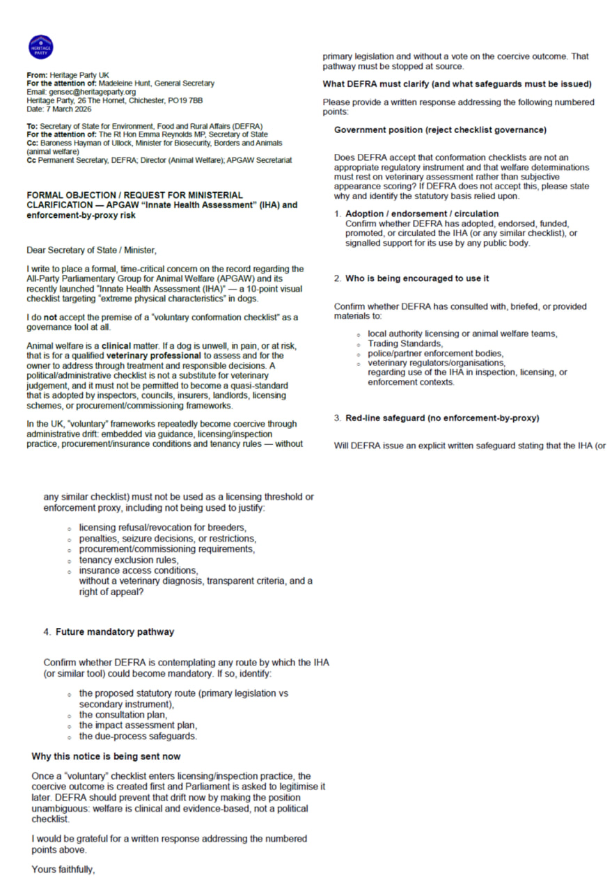 The Heritage Party has issued a formal objection to DEFRA regarding the All-Party Parliamentary Group for Animal Welfare (APGAW) “Innate Health Assessment (IHA)” — a 10-point conformation checklist being promoted as “voluntary”.